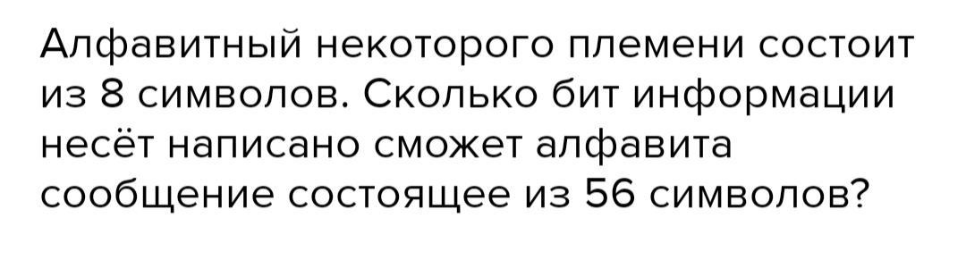 Алфавит некоторого племени состоит из 8 символов. Сколько бит информации несёт сообщение, состоящее из 56 символов.