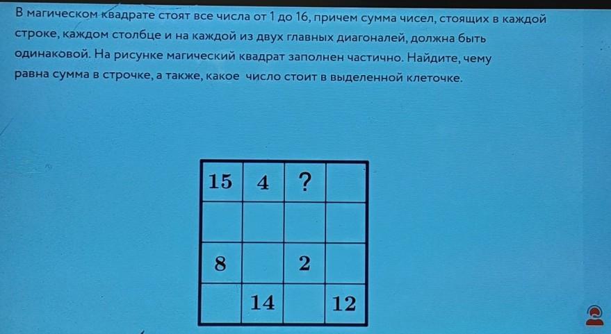 сумма каждого столбца каждой строки и больших диагоналей должна равна 34