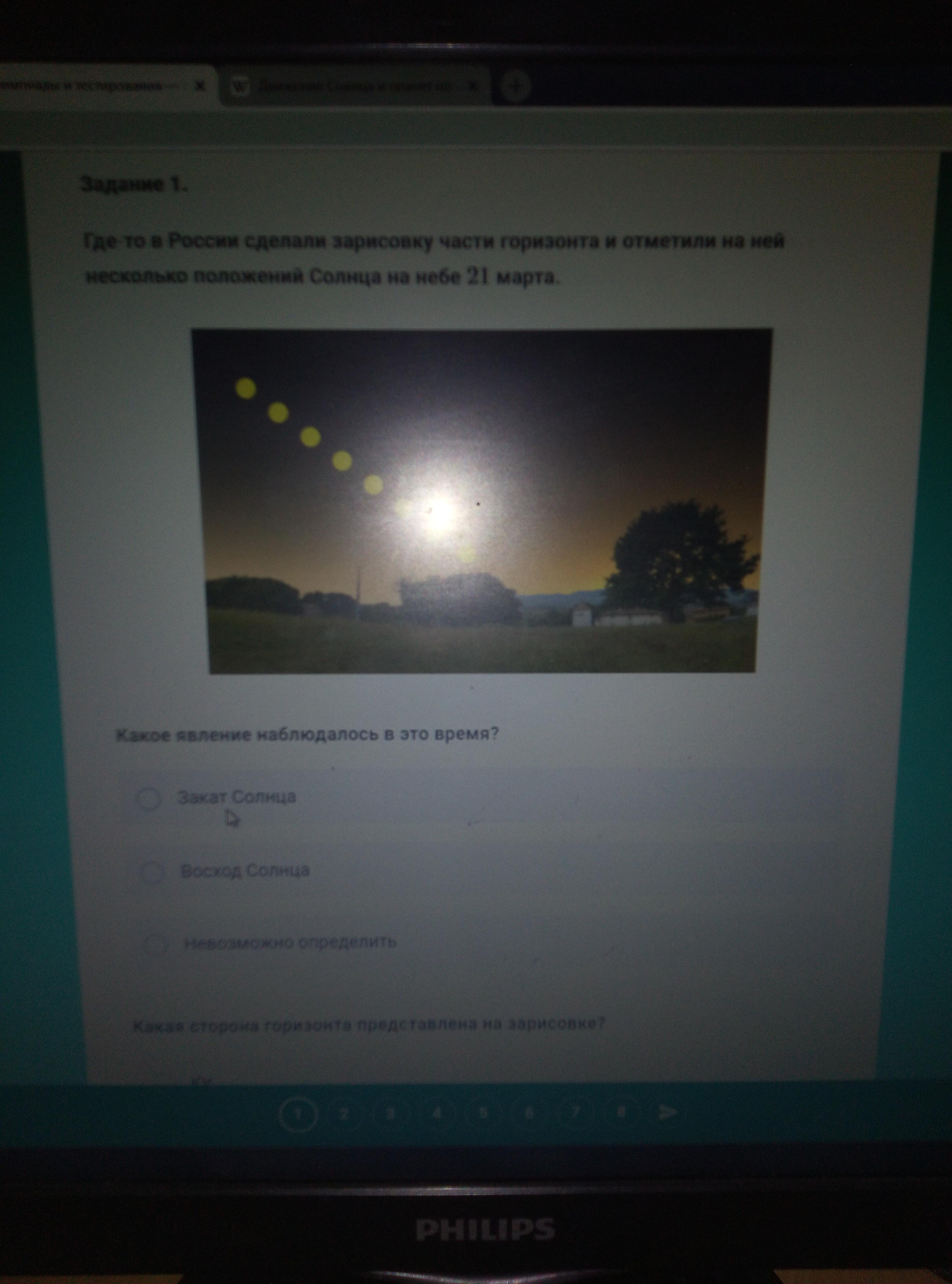1) невозможно определить, потому что мы не заем именно где в России, там сказано где-то 2) Солнце садится слева вниз, а встаёт с низу вправо вверх, поэтому там показана строна Запад, так как Солнце садится на Западе.