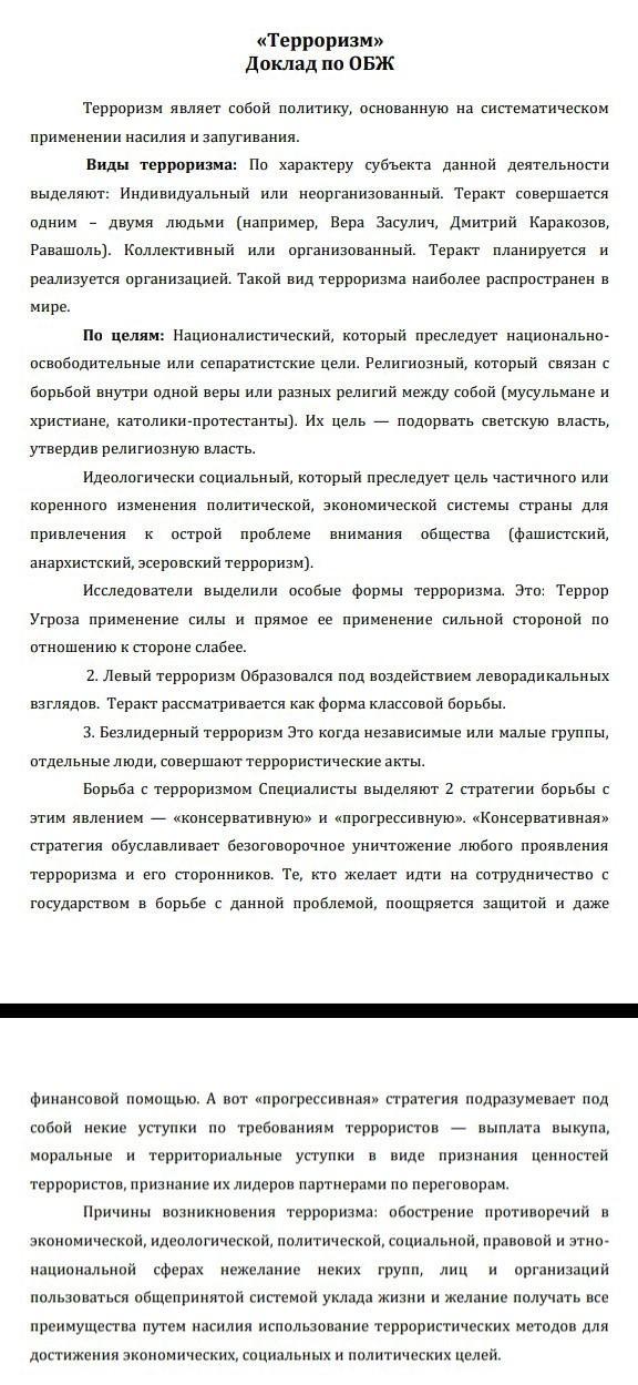 Суть терроризма – насилие с целью устрашения. Субъект террористического насилия – отдельные лица или неправительственные организации. Объект насилия – власть в лице отдельных государственных служащих или общество в лице отдельных граждан (в том числе иностранцев, или госслужащих иных государств). Кроме того – частное и государственное имущество, инфраструктуры, системы жизнеобеспечения. Цель насилия – добиться желательного для террористов развития событий – революции, дестабилизации общества, развязывания войны с иностранным государством, обретения независимости некоторой территорией, падения престижа власти, политических уступок со стороны власти и т.д.