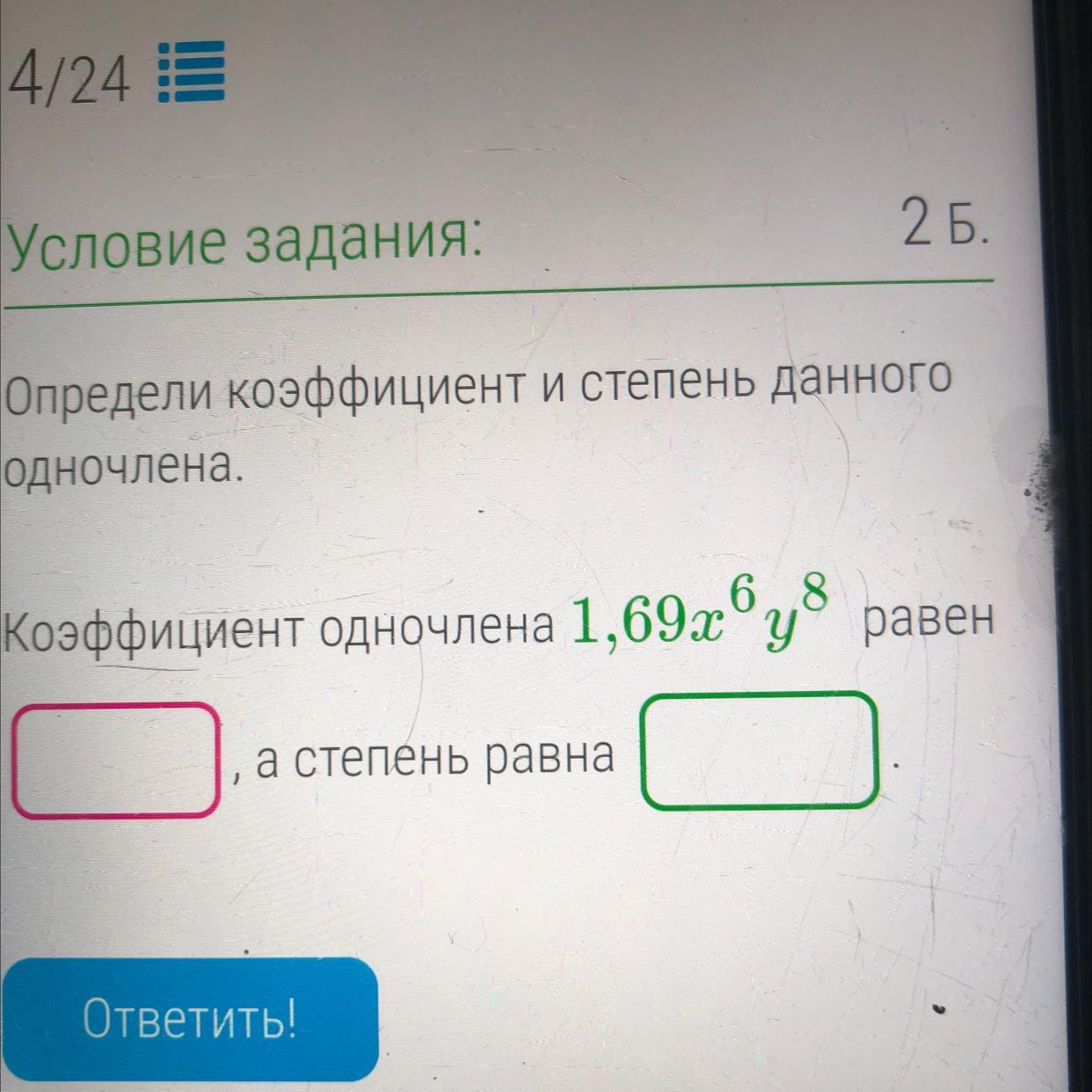 Определи коэффициент и степень данного