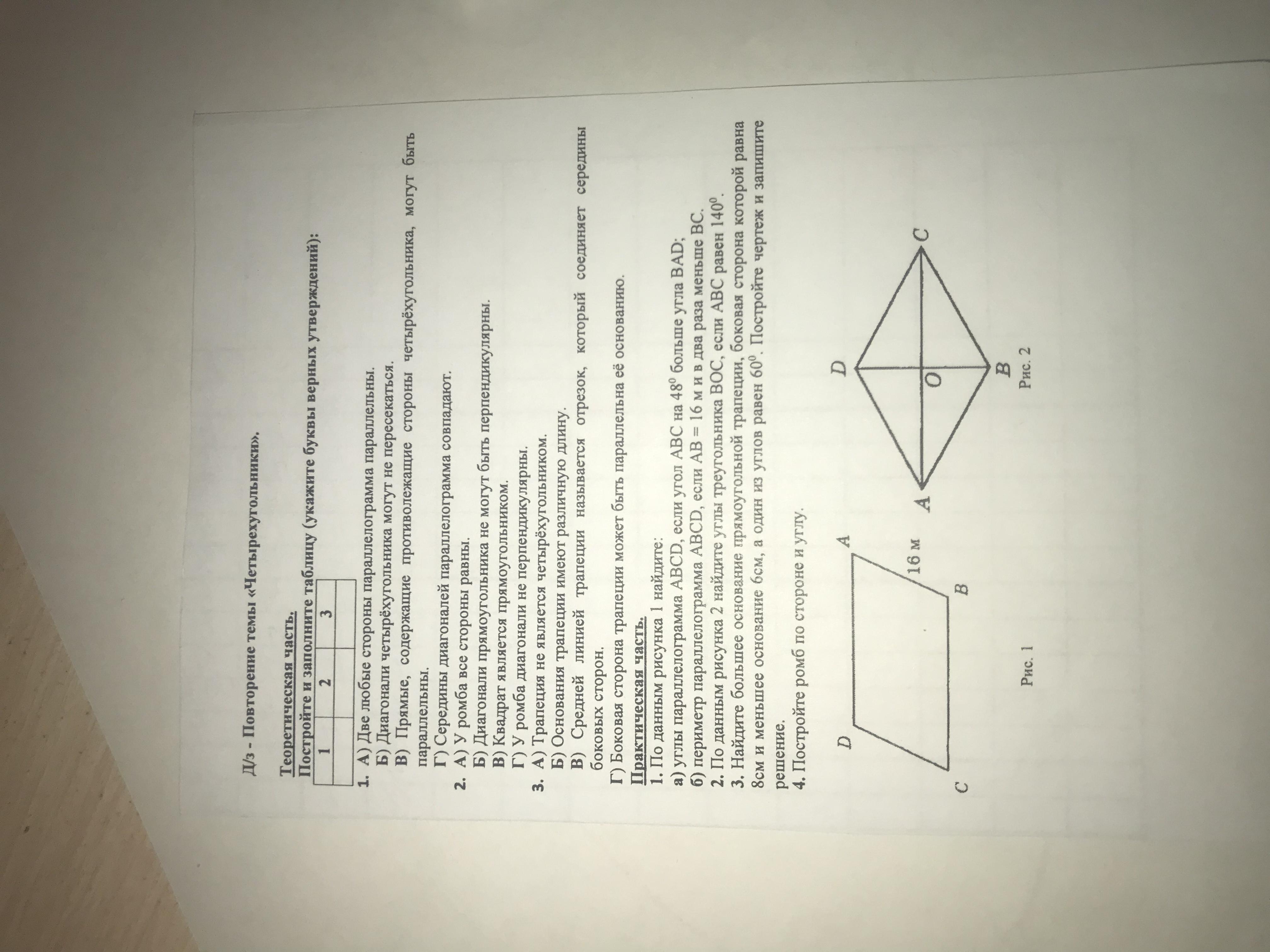 Таблица : 1В 2В 3В. Практическая часть : 1. a) 66;66;114;114 b) CB>AB в 2 раза, следовательно CB = 16*2=32. DA = 32 так как параллельны стороны равны. P = 16+16+32+32=96. ЗАДАНИЕ 2 : OBC = 70; BOC = 90; OCB = 20. Ответ : 70;90;20.Объяснение: применяется правила параллелограмма. Рисунки прикрепить не могу, так как с ПК пишу