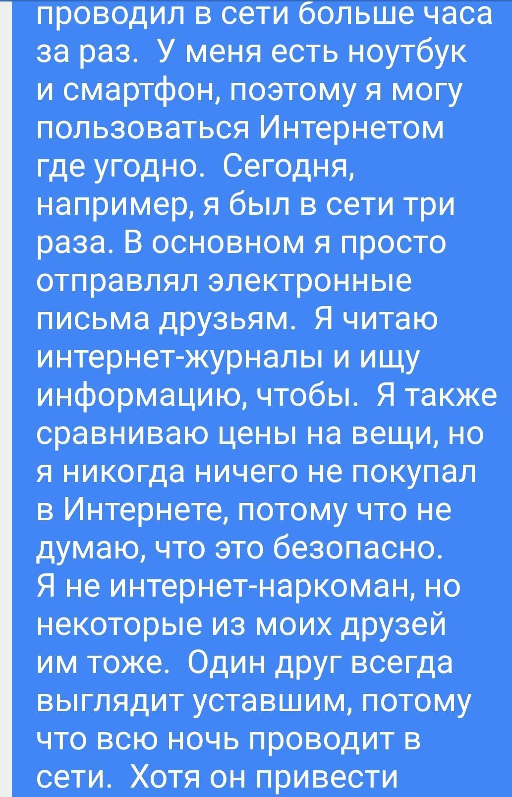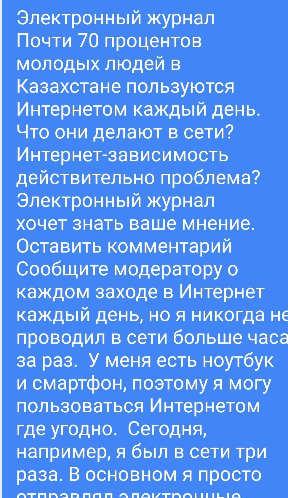 E-zine Nearly 70 per cent of young people in Kazakhstan use the internet every day. What do they do online? Is internet addiction really a problem? E-zine wants to know your opinions. Post a comment Report to moderator a a I go on the internet every day, but I've never spent more than an hour at a time online. I've got a laptop and also a smartphone, so I can use the internet anywhere. Today, for instance, I've been online three times, Mainly, I just email friends. I read online magazines and I look for information, too. I also compare prices of things, but I've never bought anything online because I don't think it's safe. I'm not an internet addict, but some of my friends are. One friend always looks tired because he spends all night online. Although he's привести