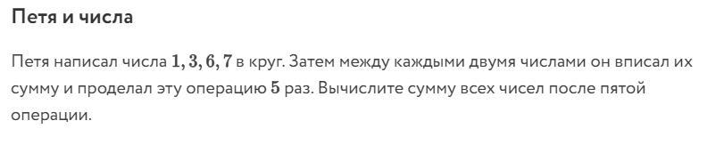 Петя написал числа 1,3,6,7 в круг. Затем между каждыми двумя числами он вписал их сумму и проделал эту операцию 5 раз. Вычислите сумму всех чисел после пятой операции.