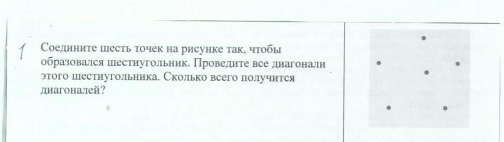 Со.едини 6 точе.к на рис.унке та.к, чтоб.ы пол.учился шес.тиугольник. П.роведите вс.е диаго.нали это.о шест.иугольника. Сколь.ко всего получи.тся д.иагоналей?
