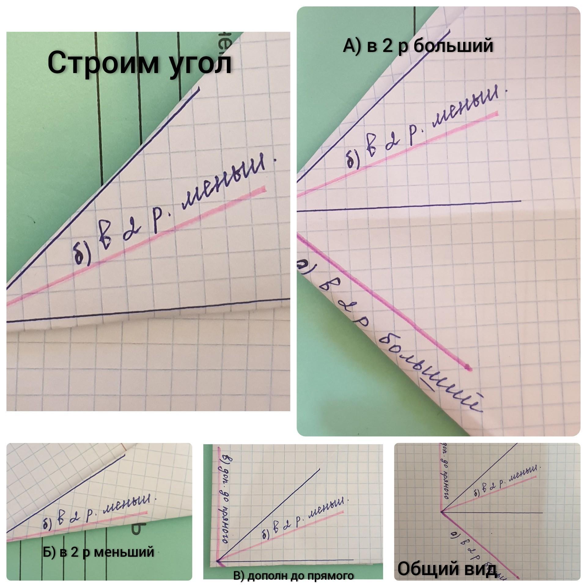 на листе бумаги Начертите угол. Сгибая лист бумаги постройте угол: а) в 2 раза больше б) в два раза меньший в) дополняющий данный до примого.