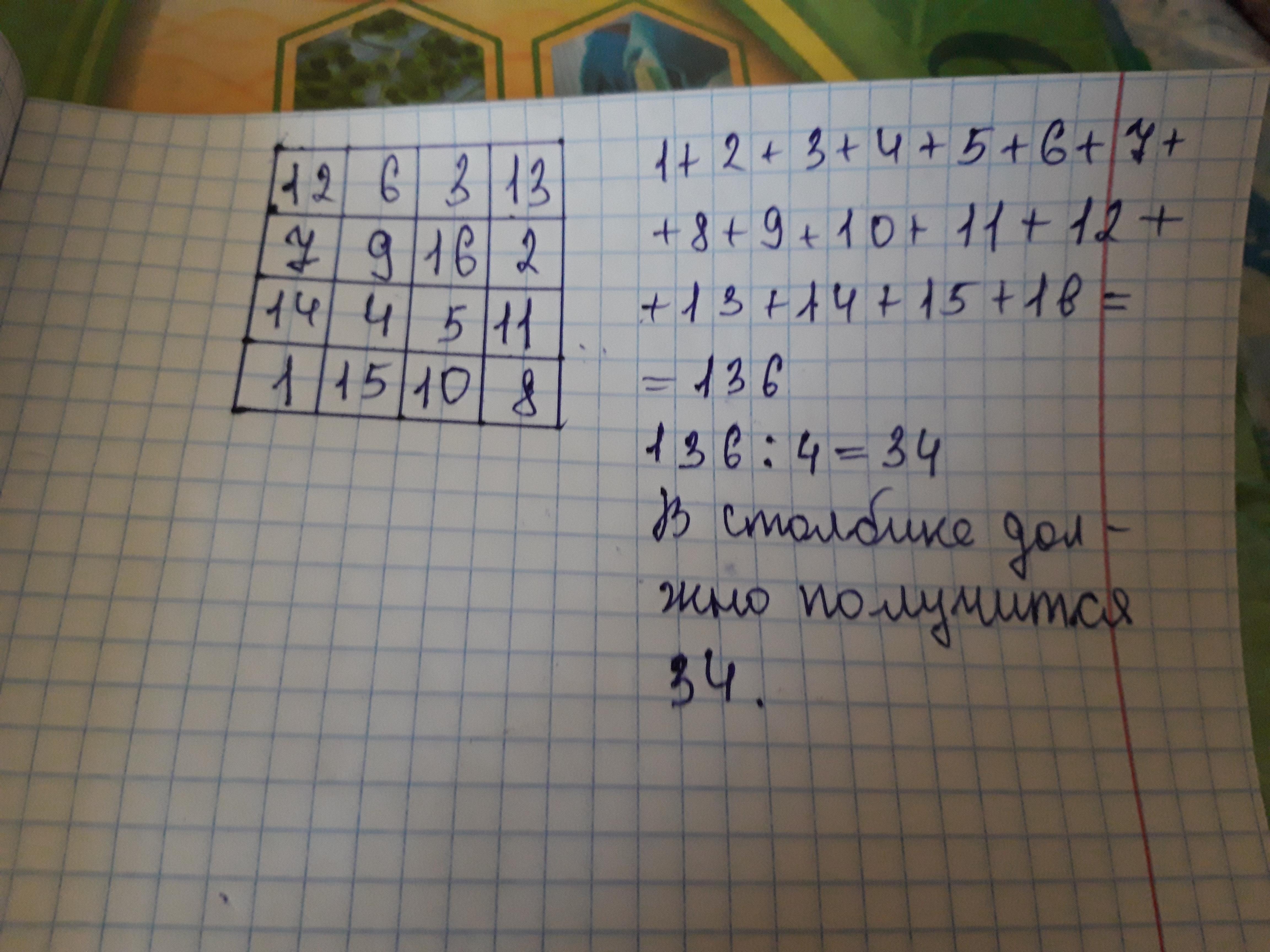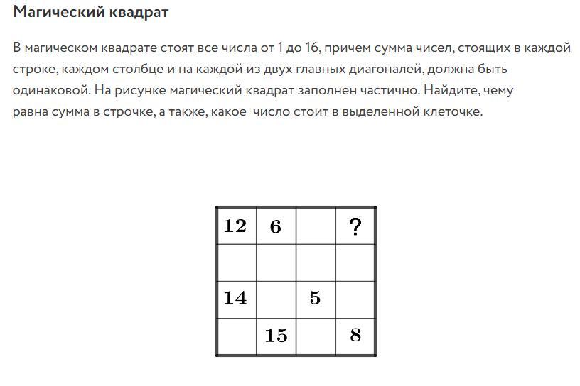 в магическом квадрате стоят все числа от 1 до 16 причем сумма чисел стоящих в каждой строке, каждом столбце и на каждой из двух главных диагоналей,должна быть одинаковой. На рисунке магический квадрат заполнен частично. найдите чему равна сумма в строчке, а также, какое число стоит в выделенной клеточке