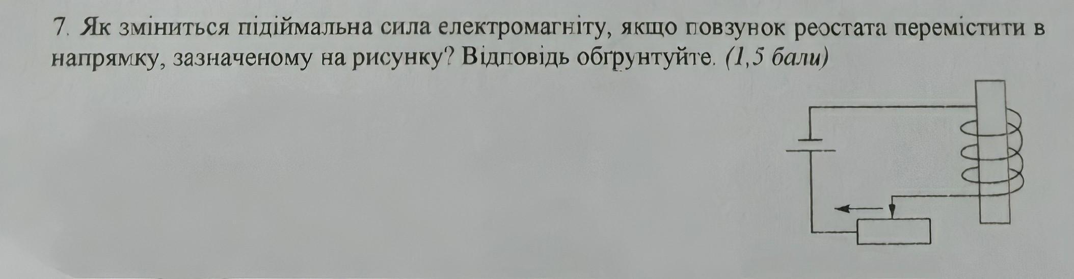 7. Як зміниться пдіймальна сила електромагніту, якщо повзунок реостата перемістити в напрямку, зазначеному на рисунку? Відговідь обгрунтуйте.