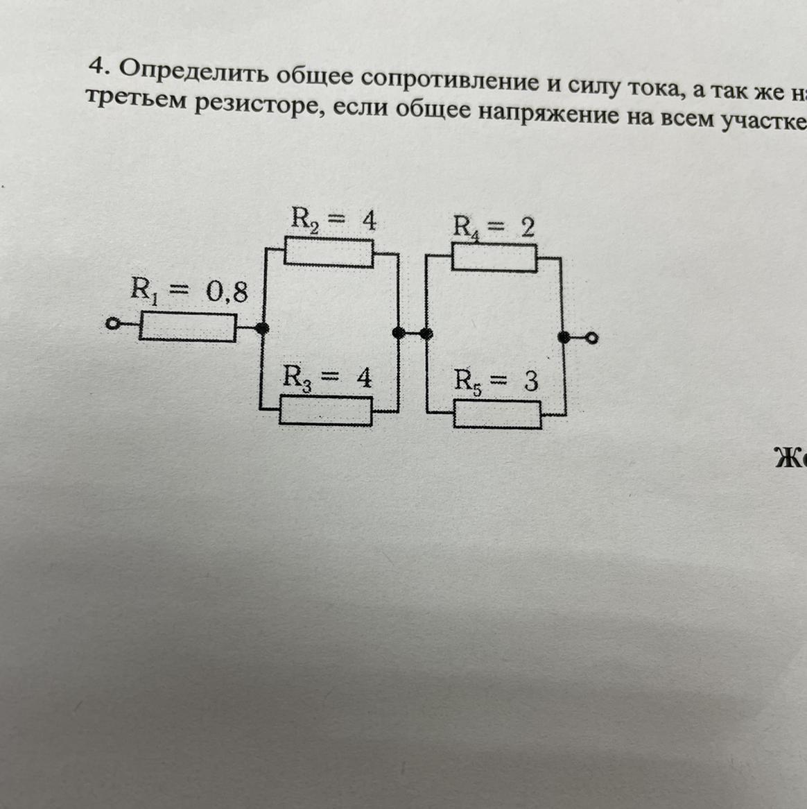 Тут надо найти силу тока ;общ сопротивление и напряжение на третьем резисторе ,на всем участке-4В