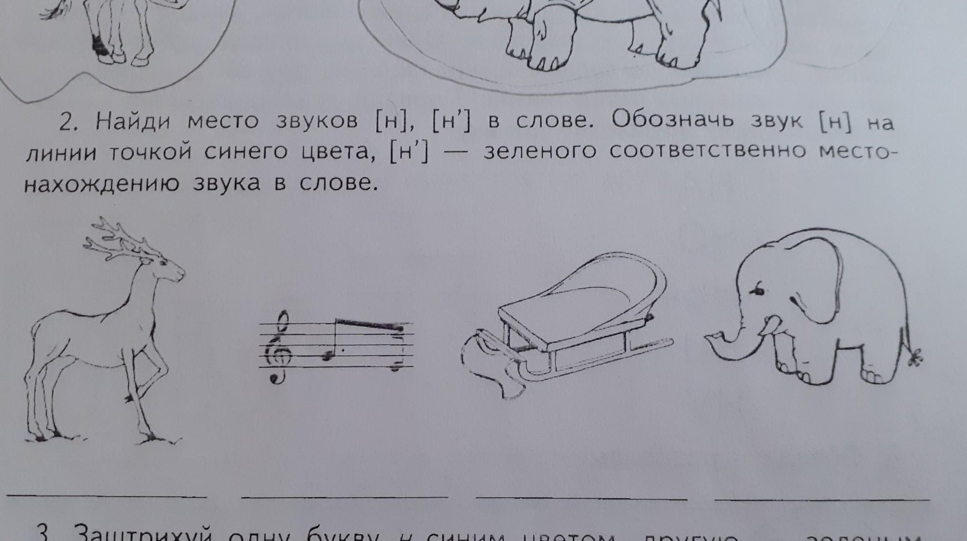 2. Найдо место звуков [н], [н'] в слове. Обознань звук [н] на линии точной синего цвета, [н'] - зеленого соответственно место нахождению звука в слове.