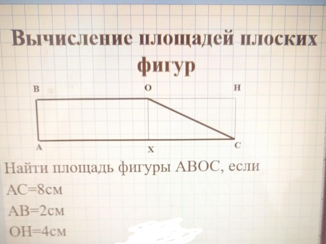 Вычисление площадей плоских фигур B 0 Н A c. Х Найти площадь фигуры ABOC, если AC=8CM AB=2CM OH=4см