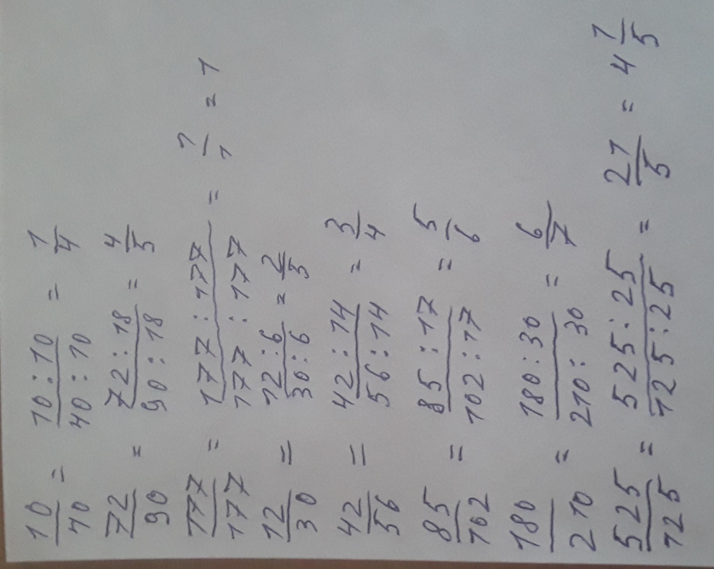 10/40=1/4,72/90=8/10=4/5,177/177=1,12/30=6/15=2/5, 42/56=6/8=3/4,180/210= 60/70=30/35=6/7,525/125=105/25=21/5=4 целых 1/5
