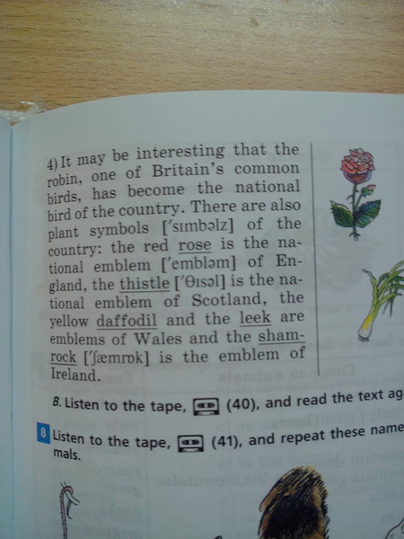 Фауна или животный мир в Англии такой же как северо западной Европе. Много больших животных таких как медведи и волки не живут на британских островах больше но множество маленьких животных лисы кролики зайцы и ежи. Олень тоже живет в лесах Англии и Шотландии. Есть различные виды рыб змей ящериц лягушек бабочек и стрекоз. Более чем две сотни видов птиц живут на британских островах и более двухсот видов пере летных. Много из них певчие весной земля окружена их пением. Самые распространенные это черные дрозды и воробьи. Множество водяных птиц лебедей уток гусей и чаек. живут на озерах и реках и морском побережье Великобритании. Это может быть интересно что малиновка одна из самых распространенных птиц стала национальной птицей страны. Также символы растений страны это красна роза символ Англии. Чертополох национальная эмблема Шотландии желтый нарцисс и лук порей эмблемы Уэльса и трилистник эмблема Ирландии