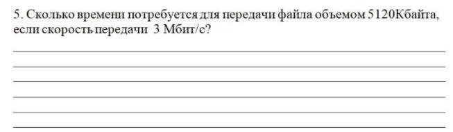 5. Сколько времени потребуется для передачи файла объемом 5120Кбайта, если скорость передачи 3 Мбит/с?