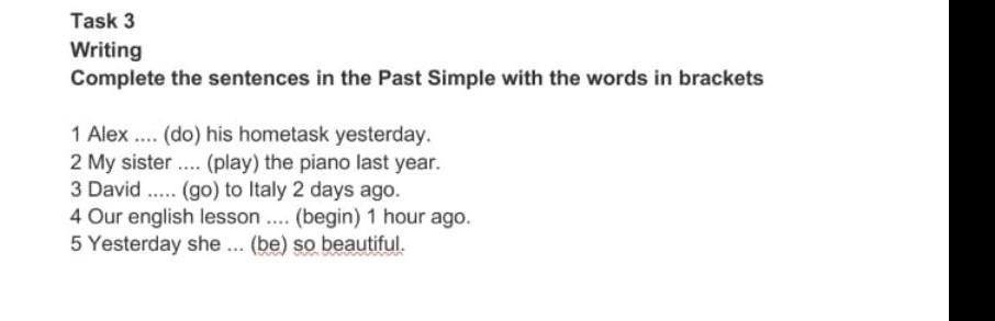 Writing Complete the sentences in the Past Simple with the words in brackets 1 Alex (do) his hometask yesterday. 2 My sister.... (play) the piano last year. 3 David (go) to Italy 2 days ago 4 Our english lesson.... (begin) 1 hour ago. 5 Yesterday she...(be) so beautiful.