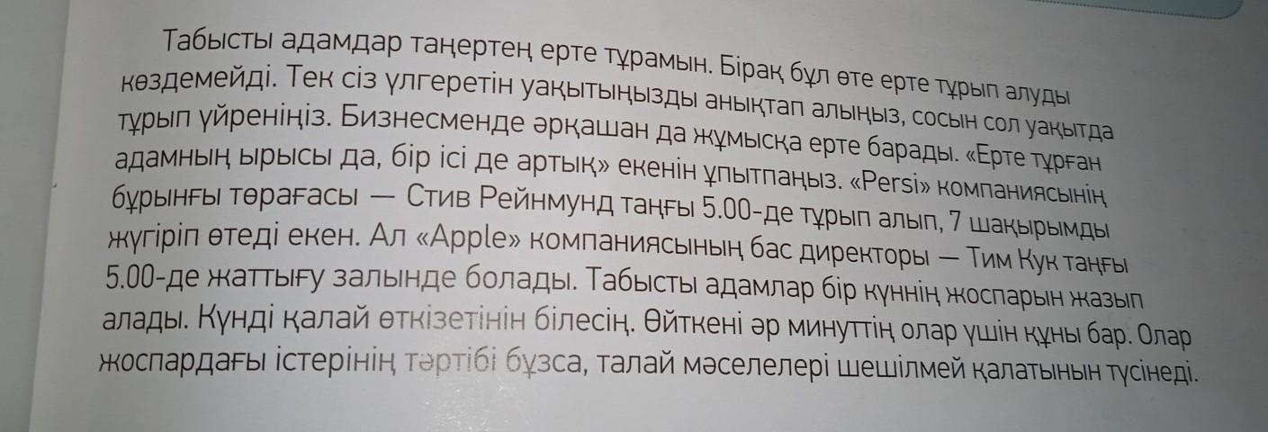Табысты адамдар таңертең ерте тұрады. Бірақ бұл өте ерте тұрып алуды көздемейді. Тек сіз үлгеретін уақытыңызды анықтап алыңыз, сосын сол уақытта тұрып үйреніңіз. Бизнесмендер әрқашанда жұмысқа ерте барады. "ерте тұрған адамның ырысы да, бір ісі де артық" екенін ұмытпаңыз. "persi" компаниясының бұрынғы төреағасы - Стив Рейнмунд таңғыы 5:00 де тұрып алып, 7 шақырымды жүгіріп өтеді екен. Ал "apple" компаниясының бас директоры - Тим Кук таңғы 5:00-де жаттығу залында болады. Табысты адамдар бір күннің жоспарын жазып алады.