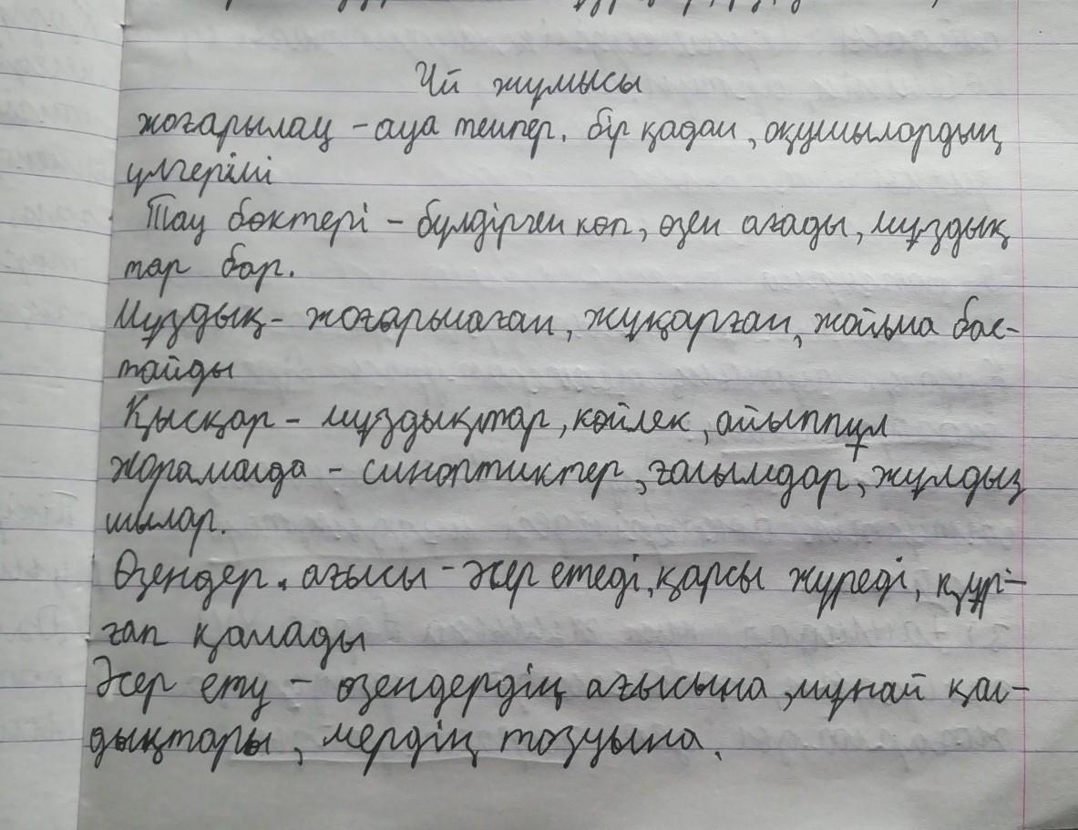 Төмендегі жаңа сөздерді тағы қандай сөздермен тіркестіруге болады? ұсынылған сөздер Nº Жаңа сөздер Қолдануға бола тіркестер мы — ауа температур 1 жоғарылау жоғарылаған ауа температурасы, тау бөктері, оқушылардың үлгерімі, бір қадам, мұнай қалдығы 2 тау бөктері бүлдірген көп, құрғап қалу, өзен ағады, тау бөктерінде мұздықтар бар, шөлейттенеді 3 мұздық Қысқарған, жоғарылаған, тозған, жұқарған, мұздықтар жойыла бастайды 4 қысқар мұздықтар, итбалық, көйлек, айыппұл, топырақ Қысқарған 5 жорамалда Синоптиктер, сүзгілер орнату, ғалымдар, өзен жорамалдайды ағысы, жұлдызшылар 6 өзендердің ағысы әсер етеді, айыппұл салынады, сүзгілер орнатады, өзендердің ағысына қарсы жүреді, құрғап қалады 7 әсер ету өзендердің ағысына, желмен тарау, мұнай әсер етеді қалдықтары, шығыны, жердің тозуына
