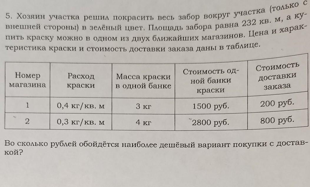 Если покупать краску в первом магазине, то потребуется 0,4×232=129,2 кг краски или 43,067 банок, за 44 банки нужно отдать 66000 руб+200 доставка и того 66200руб