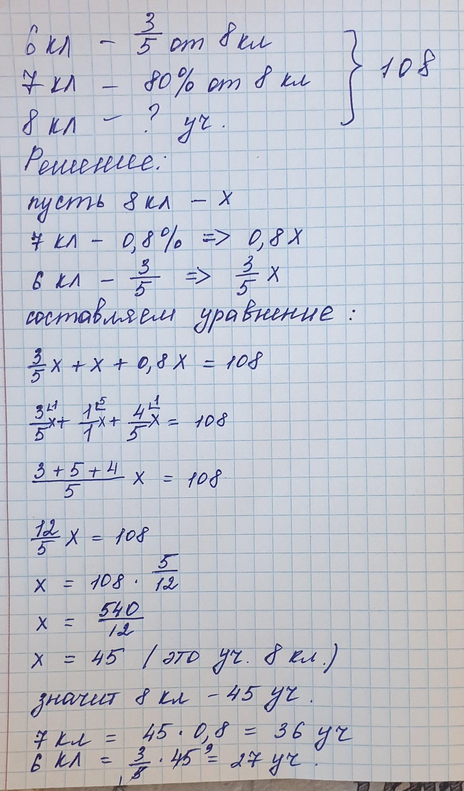 в 6 7 и 8 классах учится 108 учеников количество учеников в 6 классах составляет 3/5 от количества учеников 8 классов а количество учеников 7 классов - 80% количества учеников 8 классов