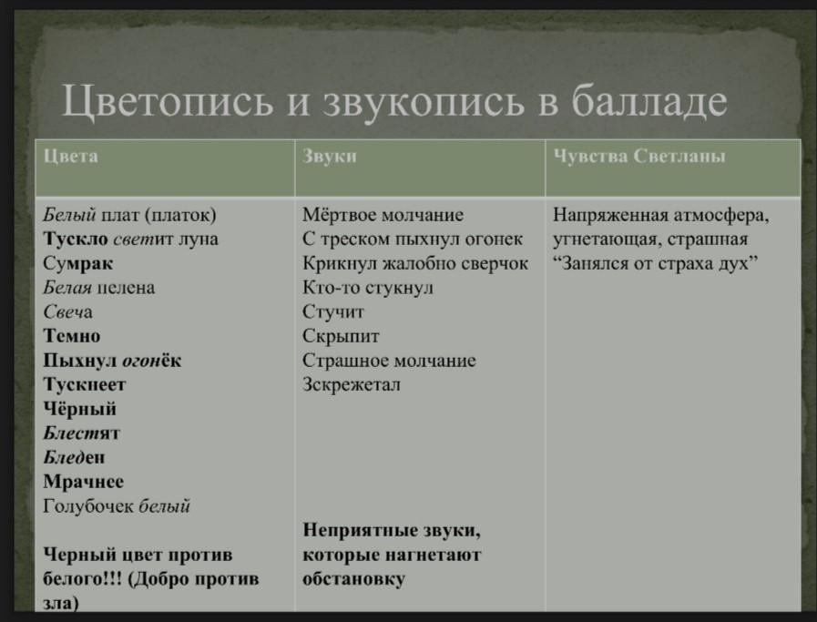 Заполните в тетради примерами из текста таблицу,, Цвет, звуки и эмоции в балладе,, Светлана""