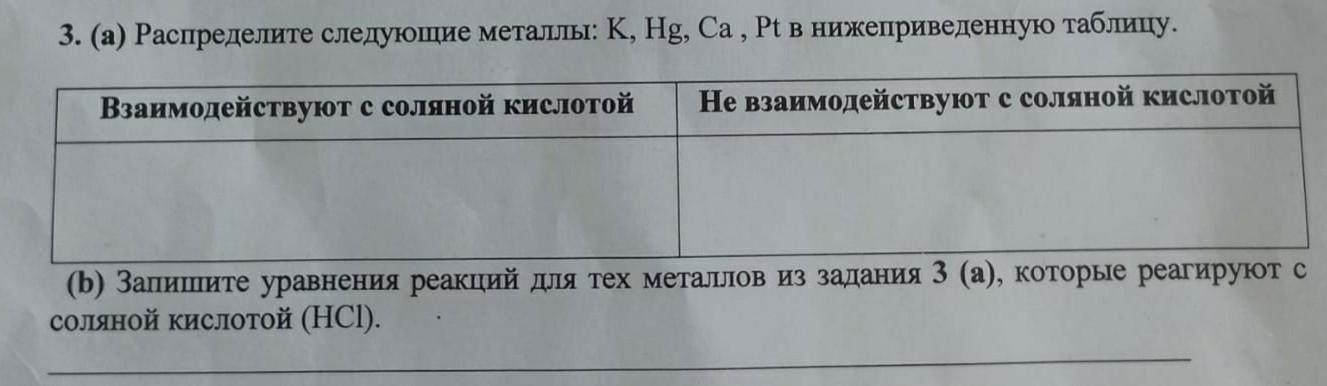 K Ca взаимодействуют, Hg Pt не взаимодействуют. 2K+2HCl=2KCl+H2, Ca+2HCl=CaCl2+H2