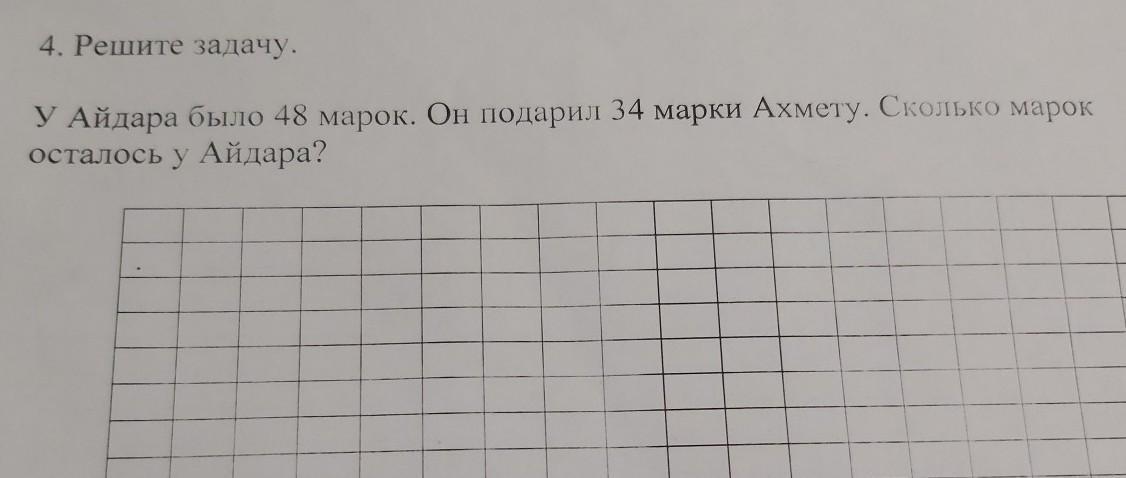 УАйдара было 48 марок. Он подарил 34 марки Ахмету. Сколько марок осталось у Айдара? решение в два действия