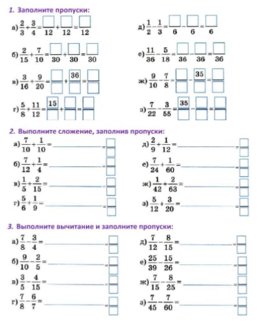 д) 1/2 - 1/3 = 3/6 - 2/6 = 1/6 ;