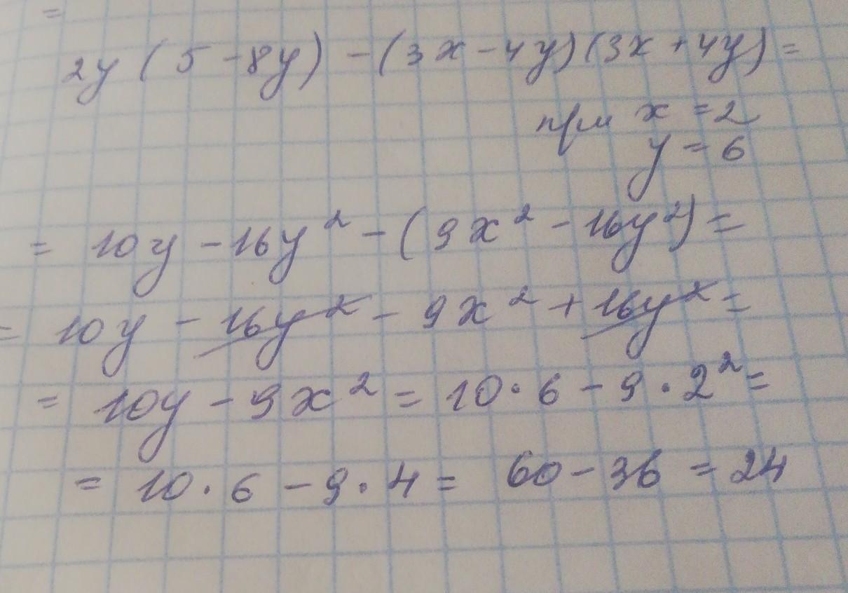 2у(5-8у)-(3х-4у)(3х+4у) при х=2, у=-6.