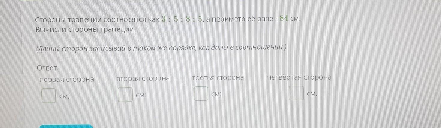 Стороны трапеции соотносятся как 3 : 5 : 8 : 5, а периметр её равен 84 см.