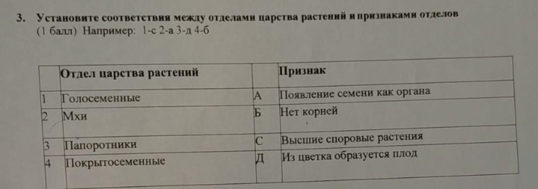 Задание было соединить отдел царства растений с признаками и совпало что порядок такой же получился