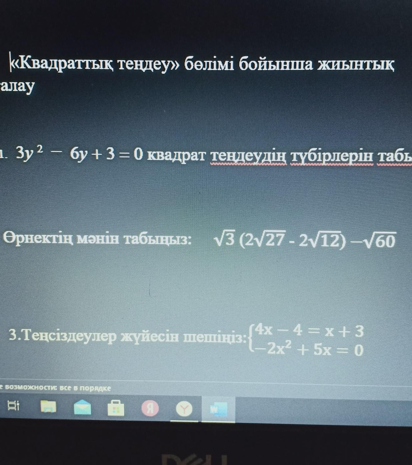 1. Зу? – бу + 3 = 0 квадрат теңдеудің түбірлерін табыңыз; [3] 2. Өрнектің мәнін табыңыз: N3 (227 - 2V12) -60 [3] (4х – 4 = x+3 3.Теңсіздеулер жүйесін шешіңіз:_2x2 + 5х = 0 -2х2 Специальные возможности все в порядке 1 В