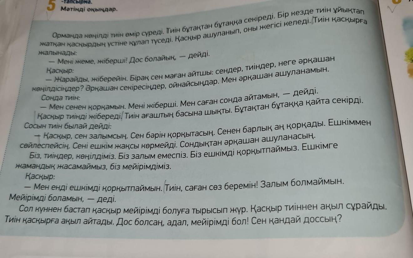 Қасқыр: -мен енді ешкімді қорқытпаймын, залым болмаймын. Содан бері қасқыр мейірімді болып жур. Тиін қасқырға ақыл айтады.