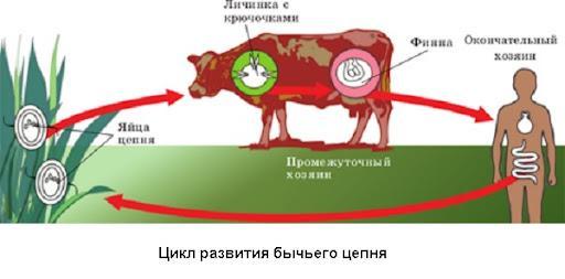 1. Яйца, которые образуются после оплодотворения в члениках бычьего цепня. Членики вместе с яйцами червя оказываются во внешней среде.