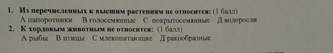 Ответ:водоросли низшие растения, ракообразные -беспозвоночные