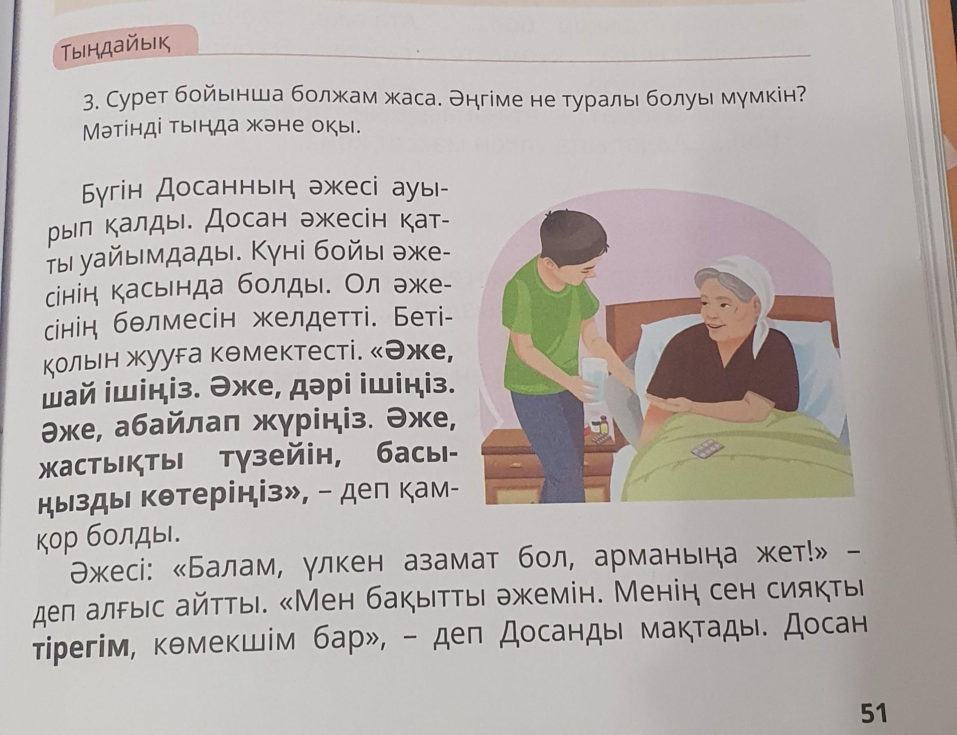 3)Досанға әжемі «Балам, үлкен азамат бол, арманыңа жет!» деп алғыс айтты. Досан әжесіне алғыс айтады.