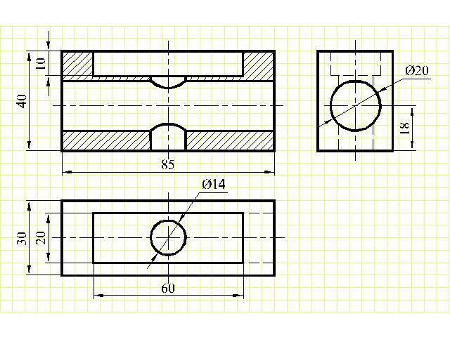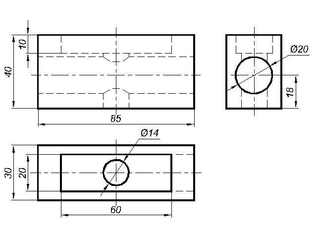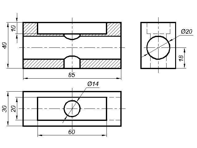 Так как размеры не указывают по невидимым (штриховым) линиям, то на втором чертеже я заменила вид спереди (главный) на фронтальный разрез.