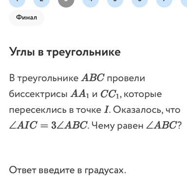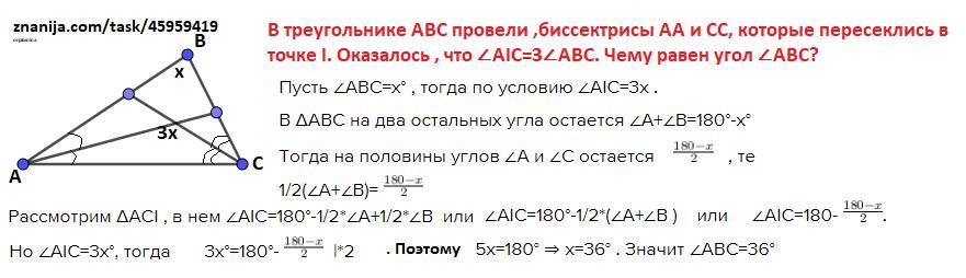 В треугольнике АВС провели ,биссектрисы АА и СС, которые пересеклись в точке I. Оказалось , что ∠АIC=3∠ABC. Чему равен угол ∠АВС?