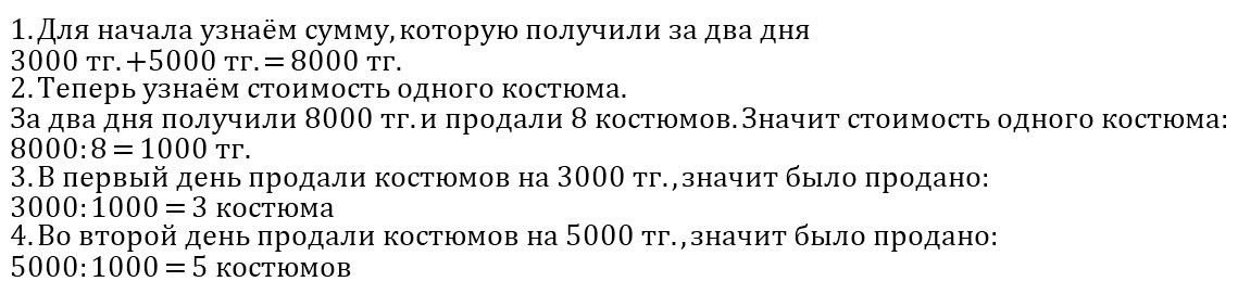 В магазине за два дня продали 8 детских костюмов по одинаковой цене в первый день сумма от продажи костюмов составила 3000 тг а во втортй день 5000 тг сколько костюмов продали в первый день во второй день