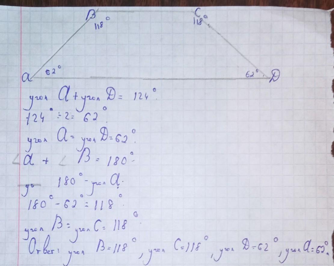 В равнобедренной трапеции сумма углов при большем основанием 124 градуса найдите углы трапеции срочно