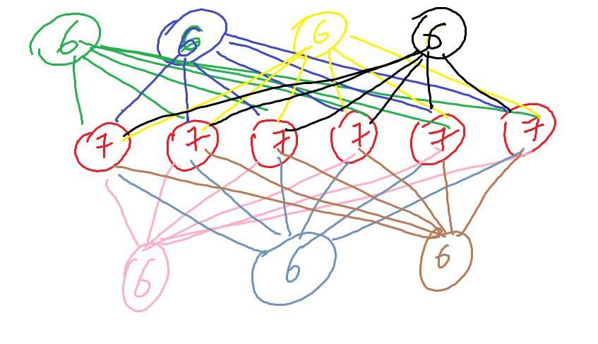 в городе N состоящим из остров с каждого острова выходит либо 6 либо 7 мостов причём у любых двух островов соединенных мостов количество исходящих из него мостов разные Из какого наименьшего кол-ва островов может состоять город N.