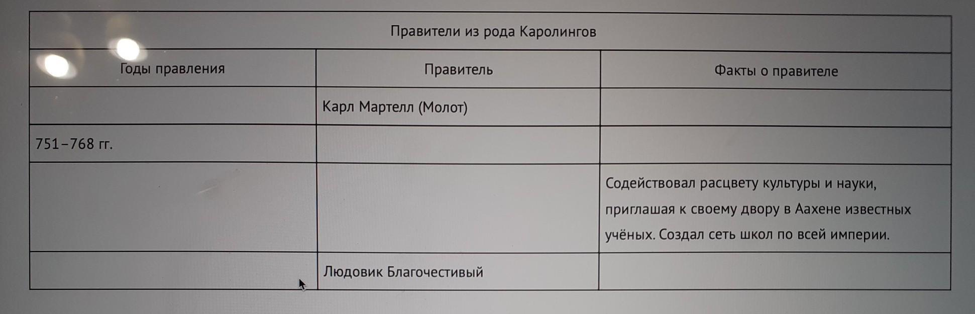ПОМОГИТЕ СРОЧНО ПОЖАЛУЙСТА!!!!!!!!!!!!!!!!!!!Задание 2 (35 баллов). Как работать со схемами и таблицами Заполните таблицу «Правители из рода Каролингов», вставив пропуски. Правители из рода КаролинговГоды правленияПравительФакты о правителе Карл Мартелл (Молот) 751–768 гг. Содействовал расцвету культуры и науки, приглашая к своему двору в Аахене известных учёных. Создал сеть школ по всей империи. Людовик Благочестивый