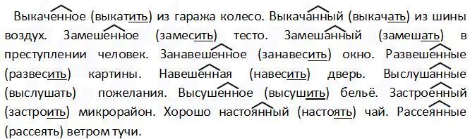 130. Проверьте себя! Спишите, вставляя пропущенные буквы, обозначая суф- фиксы причастий. Обоснуйте выбор пропущенных гласных, записывая рядом с причастиями глаголы, от которых они образованы. Выкач..нное из гаража колесо. Выкач..нный из шины воздух. Замеш..нное тесто. Замеш..нный в преступлении человек. Занавеш..н- ное окно. Развеш..нные картины. Навеш..нная дверь. Выслуш..нные пожелания. Высуш..нное бельё. Застро..нный микрорайон. Хорошо насто..нный чай. Рассе..нные ветром тучи.