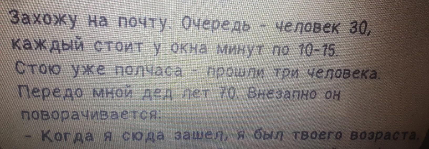 I go to the post office.There is a queue of 30 people, everyone stands at the window for 10-15 minutes.