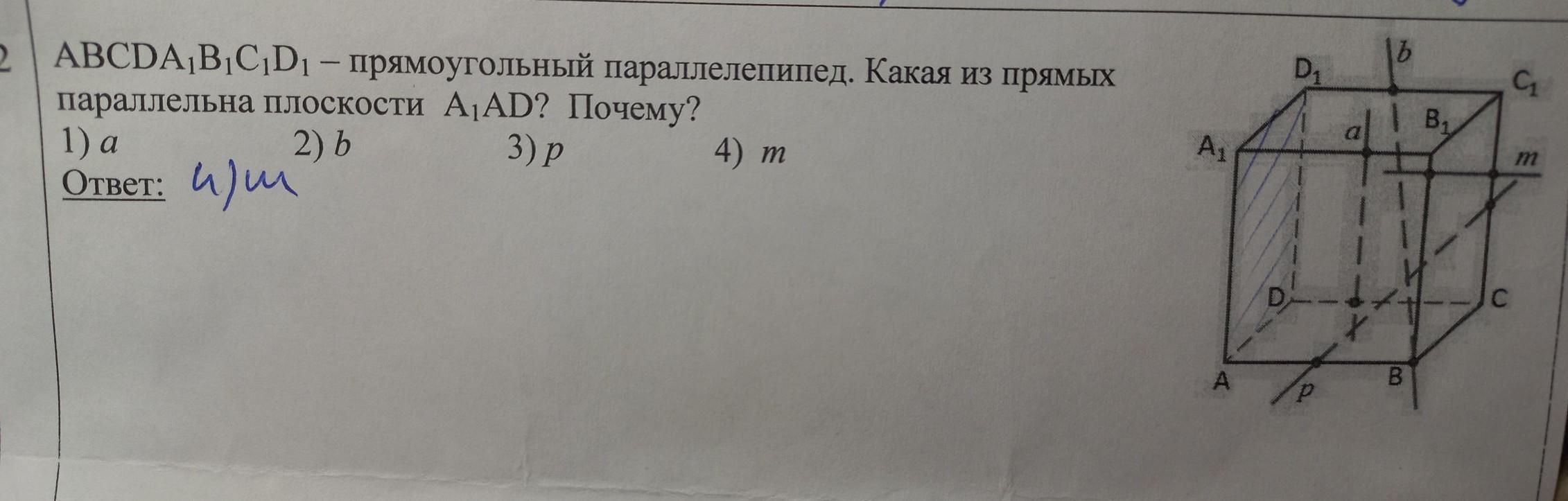 В прямоугольном параллелепипеде противоположные грани параллельны, прямая m лежит в плоскости ВВ1С, которая параллельна плоскости А1АD