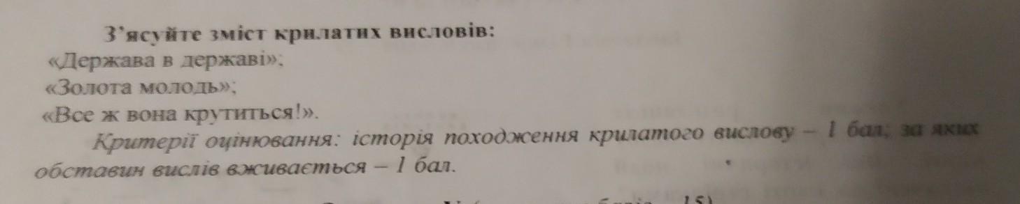 З'ясуйте зміст крилатих висловів; «Держава в державі»; «Золота молодь»; «Все ж вона крутиться!», Критерії оцінювання: історія походження крилатого вислову 1 бал; за яких обставин вислів вживається - 1 бал.