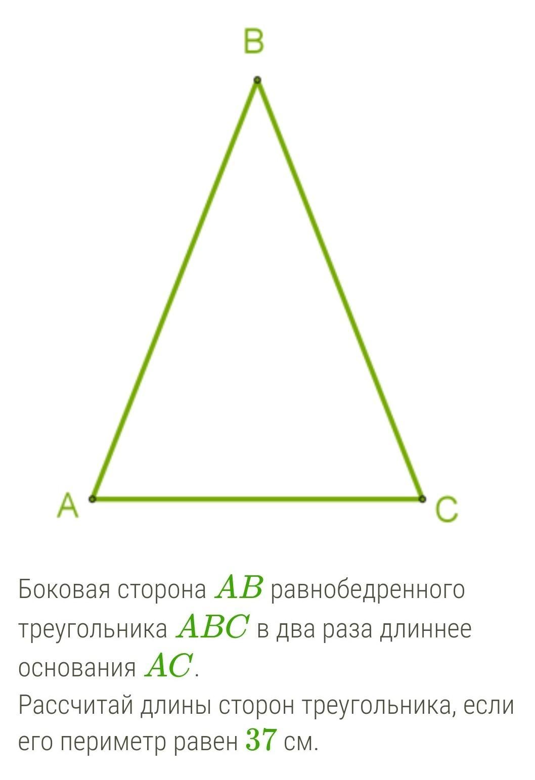 Пусть основание треугольника -Х см,тогда его боковые стороны -по 2Х см.По условию сост. уравнение Х+2Х+2Х=37