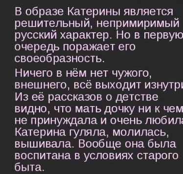Екатерина является решительный непримиримый характер Ну в первую очередь поражает его своеобразность ничего в нём не чужого внешнего всё выходит изнутри из неё рассказов о детстве видно что мать дочку ни к чему не принуждал А и очень любила Катерина гуляла молилась вышивала она была воспитана в условиях строгого быта