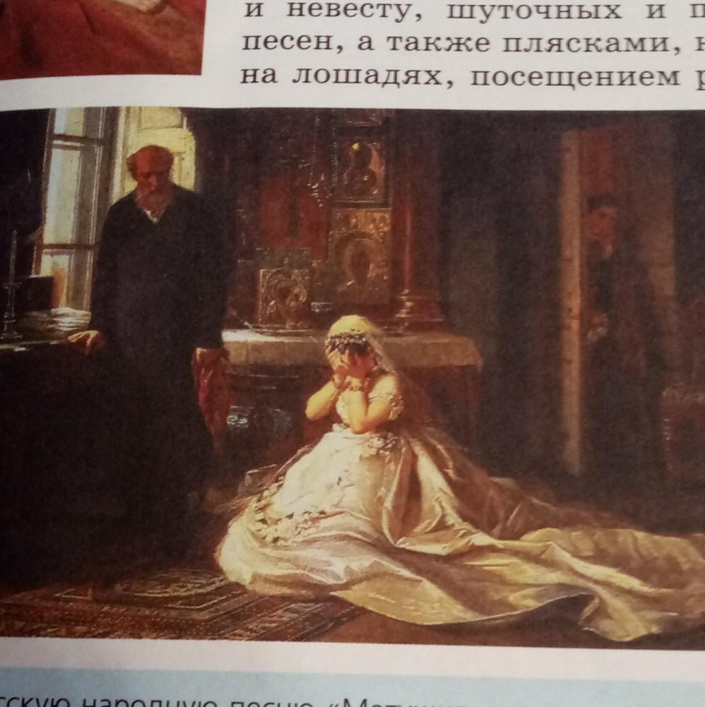 Барышня рыдает, в отчаянии закрыв руками лицо. Сзади немолодой мужчина, верно причина еë страданий, стоит, не смея подойти к девушке, чтобы утешить её. Свадьба по расчету - частое явление во времена старой Руси. Тогда же молодых дам выдавали замуж за старых богадых бояр. На картине видно, что происходит именно эта обыйденная в то время ситуация... К сожалению даме придется смириться со своим новым статусом. Ах! Жизнь отвратна стала молодой барышне. Она в отчаянии, в смятении, в своих собственных мыслях.