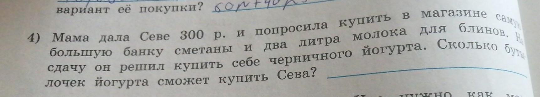 Помогите решить это: мама дала Севе 300 руб и попросил купить в магазине самую большую банку сметаны и 2 л молока для блинов на сдачу он решил купить себе чернильную йогурта сколько бутылочек йогурта сможет купить Сева