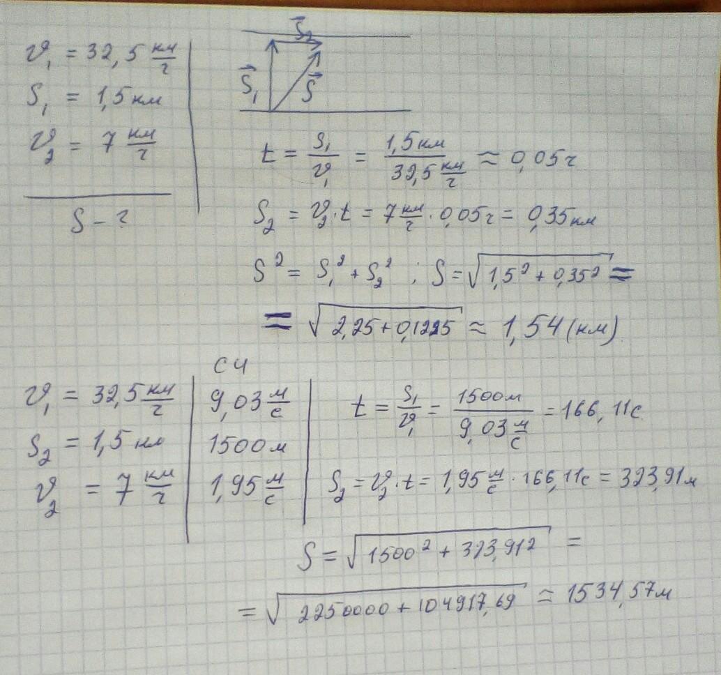 Моторная лодка, двигаясь, держит курс перпендикулярно к течению реки, обладая скоростью 32,5 км/ч, переплывает реку шириной 1,5 км. Скорость течения реки — 7 км/ч. В ответе напиши перемещение моторной лодки от начала движения. Ответ (ответ и промежуточные вычисление округли до сотых):
